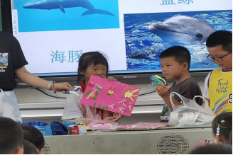 负责本课时的施韩锴以海洋动物为主题,将本课堂分为问题导入、科普视频介绍、动手制作、小组评比四个环节。在科普视频介绍环节,施韩锴主要向学生们介绍了海豚、蓝鲸、鲸鲨、虎鲸的形态特点和生活习性。浴池小学的学生们在手工课课上表现出极大的兴趣,他们认真观看科普视频,并在之后的提问环节中积极地回答有关此次科普知识的问题。