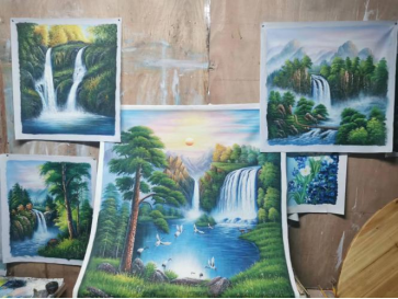 在采访过程中,调研组成员了解到,近几年来,曾凡茂、张蓉在画室开设油画指导课程:他们为想要尝试油画的游客提供画笔和颜料,指导他们在短暂的时间里完成一幅画作,并免费为残疾人进行油画教学。在他们看来,油画技术能够帮助更多残疾人自力更生,乡村振兴事业能够让更多农村人过上好日子。虽然能做的不多,但是他们会尽己所能坚持下去。此外,曾凡茂还介绍到,画室的两间小屋子里,挂满了他们画的花园阁村村景以及自然景观,调研组成员在欣赏工艺之美的同时,也感受到了自然的气息。