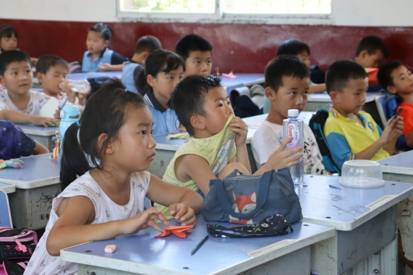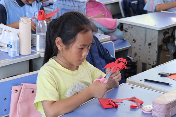 此次活动共分为三个阶段。第一个阶段为动员准备,由实践团成员张家勇和黄海容带领“小太阳”班、吴菲和岳君瑶带领“童心童语”班、谭佳颖和王宇轩带领“逐梦”班的学生们进行了不同”红色“手工艺品的学习和制作。当学生们听到自己的作品可以交换物品时,也是表现的十分兴奋,活力满满。第二阶段为”集市交换“,在实践团成员的引领下,所有同学以班级为单位,携带自己制作的手工艺品前往红色摆摊集市(食堂)交换心仪的糖果、饮料以及饼干等物品。同时,各年纪级的小朋友也可以利用自己手中的物品去换取他人手中的手工作品。交换活动火热进行中,“商品”很快就被一扫而空。第三阶段为”故事观赏”,各班班主任组织学生们观看了爱国题材动画——《那年那兔那些事儿》。天气炎热,但孩子们看的却极其认真。在理解了动画背景后,还向老师们提出了许多问题。与此同时,各班班主任也将学生们的优秀作品放到了教室外的展板上进行展示。课间,学生们也发现了展板的不同,纷纷向老师指出了自己的作品,神情中流露出肉眼可见的高兴和自豪。此次活动达到了预期的效果,学生们热情高涨,课堂上其乐融融,集市交换时踊跃参与。