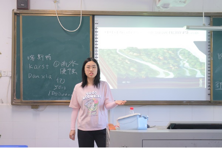 陈远从丹霞山的简介、丹霞山的来源和丹霞山的资源三大方面开展课程。课程伊始,陈远对丹霞地貌命名地丹霞山和丹霞山世界地质公园的发展历程进行说明,并为学生科普了对丹霞地貌做出重要贡献的中国科学家。陈远以图片示例的形式重点讲解丹霞地貌顶平、身陡、麓缓的特征。同时陈远通过广东丹霞山、贵州赤水丹霞等典型丹霞地貌加深学生的印象,并介绍丹霞山丰富的动植物资源。为检验学生的听课效果,陈远在课程最后进行互动提问。此外,陈远还将丹霞的地理知识制作成展板放置于教室供学生学习。