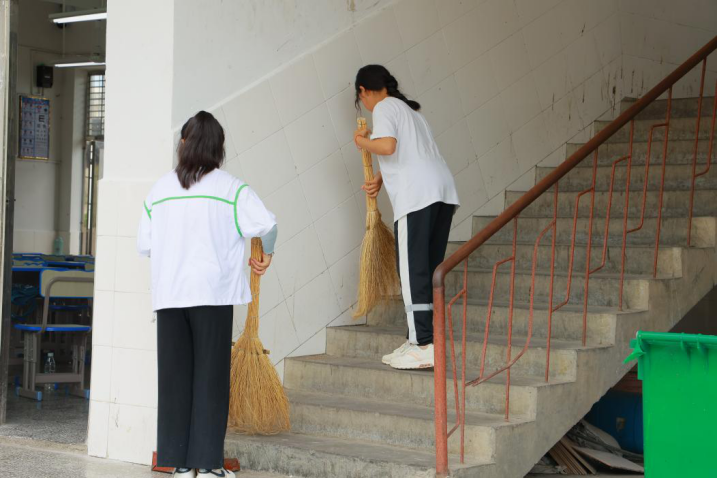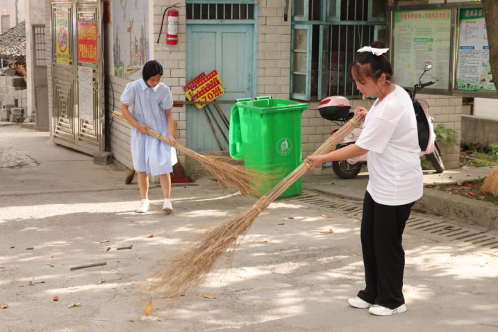 实践团成员朱茹玉、邓仕杰宣讲卫生知识,对学生进行卫生教育。随后,全校开展大扫除,在朱茹玉和邓仕杰的指导下,全体成员齐心协力,分工合作,对办公和教学区域、楼道、绿化带等公共场所的垃圾、落叶等杂物进行彻底清扫。