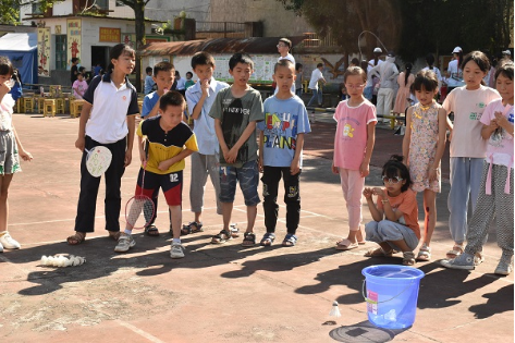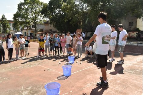 活动伊始,高俊威向学生们介绍游戏规则,学生需要站在白线后面,用球拍将羽毛球拍打进桶。同时,他叮嘱学生们注意安全,遵守游戏规则。各年级同学依次排队进行比赛,经过激烈的角逐,五年级同学拔得头筹,勇创佳绩。旁观的学生们鼓掌呐喊,热情高涨。实践团工作人员组成一支支“机动部队”,拍照,送水等等,为参赛的学生们提供后勤保障。