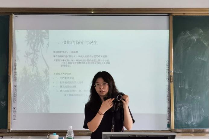 唐思琦从摄影的诞生、发展、改进等方面进行讲解,并鼓励同学们提出个人对摄影的看法。同学们在课堂上积极互动,展现出对摄影的兴趣。唐思琦从摄像的原理方面开启此次课程,引导同学们深入理解摄影技术的形成过程。同时,她介绍各个时期摄影法的名称、发明人、制作过程、优缺点,并从成像技术、存储介质、输入输出方式三个方面解释数字化摄影与传统摄影的不同。唐思琦总结,摄影技术的发展不是一蹴而就的,它需要许多人钻研技术、开拓创新。