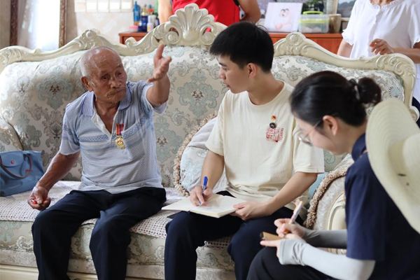 在老党员彭良必的家中了解到,他于1951年参军,曾参与抗美援朝战争与剿匪斗争。他说道,当时每天都有战友牺牲,但我们没有一丝恐惧,时刻准备着为国捐躯。他嘱咐我们“要跟党走、听党话,多为党和人民做贡献”。