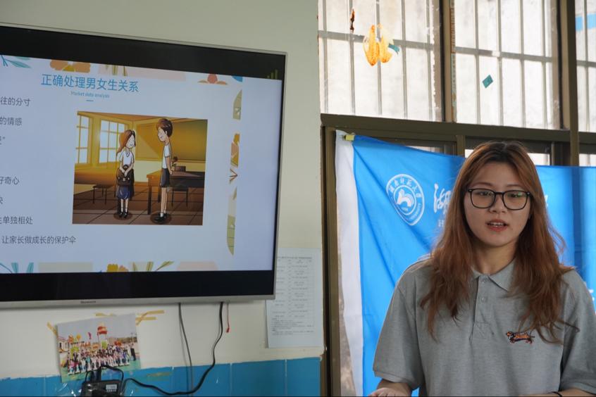 本次的教学活动对男女生分别进行教学,男生组教学由唐博闻负责,女生组由陈言晴、汪仕祺负责。教学活动主要分为三个板块,一是介绍男女生青春期的生理变化,着重介绍了女生月经相关知识及生理期注意事项。二是对男女生进行青春期的心理教育。最后组织主题绘画课,让学生自由畅想画出青春自画像,考查学生青春期审美认知水平。