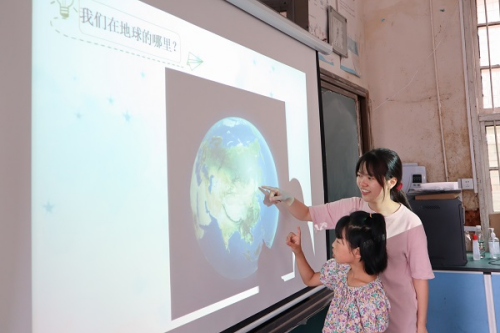 课程伊始,王梁美子以太阳东升西落、四季更替等生活现象为例,介绍了地理的概念。她带领学生认识地球,感知中国,了解自然,通过介绍各类地图展开课程的学习。互动环节,王梁美子展示地球图片并提出相关问题,让学生上台结合地图进行回答。