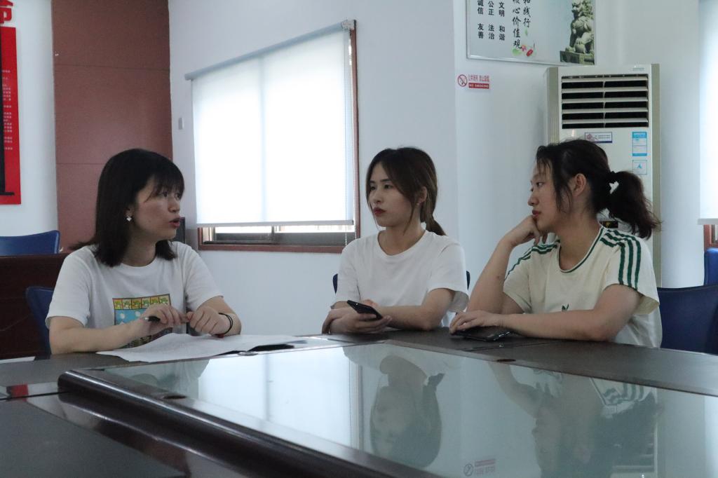 图为团队成员采访廖家湾社区居委会书记邓晴,着重交流有关廖家湾社区党史教育工作的部署情况和反响效果