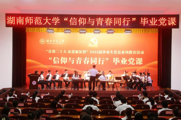 活动开始前,音乐学院的艺术团的同学以民乐合奏、合唱等方式演奏红色经典音乐《浏阳河》《微山湖》《我爱你中国》,给参加活动的毕业生党员代表呈现了一堂特色鲜明的音乐微党课。