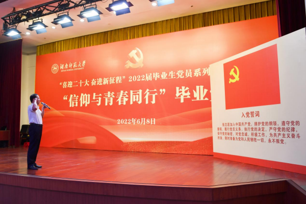 外国语学院本科毕业生党员马纯宇、马克思主义学院硕士毕业生党员李鑫鑫、生命科学学院博士毕业生党员晏锡泉等三人作为毕业生党员代表先后发言,回忆了在师大树理想、磨意志、学知识、拓视野的难忘经历,讲述了作为青年大学生党员的初心使命和理想追求,他们代表毕业生党员许下庄重承诺:“作为青年党员,我们要在新的征程中持续奋斗,续写湖南师大的光荣传统——仁予人,爱乎众,精其事,勤于行,将所学与国家和社会发展形势结合起来,更好地为国家和人民服务,为实现中华民族伟大复兴的中国梦贡献自己的青春力量!”
