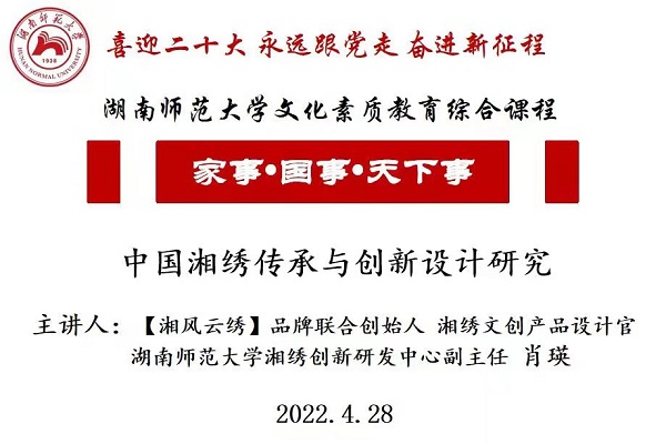 (通讯员 张辰昱 徐筱迪 冯珂瑶)4月28日晚,我校《家事·国事·天下事》文化素质教育综合课程第五讲以线上形式召开。本次课程由“湘风云绣”品牌联合创始人、湘绣文创产品设计官、太阳成集团tyc湘绣创新研发中心副主任肖瑛老师主讲,校学生会主席团成员冯珂瑶主持。