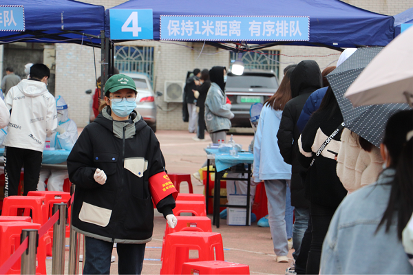 恰逢长沙气温骤降,阴雨绵绵。200余名“青年抗疫突击队”志愿者在各检测点,轮流交班,坚守岗位,连轴奋战,累计服务时长达1500余小时。检测现场虽寒风凛凛,但无一人抱怨。检测任务虽紧急繁重,但无一人退缩。直至20日晚9时二里半校区检测任务完成,最后一批志愿者方才陆续回寝休息。期间,“青年抗疫突击队”志愿者以其决然的坚守,工作的细致,无私的奉献,得到我校师生的广泛好评。历史文化学院团委老师陈卓君说道:大事难事看担当,危难时刻显本色。团员青年的主动请缨,无惧严寒,让我们坚信本轮疫情防控必将取得胜利!