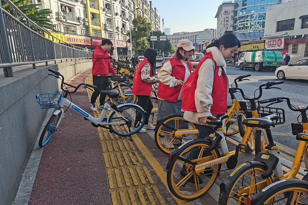 志愿者将压住盲道的共享单车移走