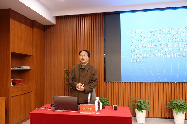 刘建州指出,对数学美的研究需要全体教师共同参与,以进一步探索出提高数学趣味性的教学方法。他从数学美学方法的特点、运用的基本途径、数学美的本质与形式等角度漫谈数学之美,向与会人员展示蕴含在基础数学、应用数学、数学公式、逻辑思维中的不同形式的数学美。刘建州认为,把模仿、移情等方式融入数学中,将数学技能技巧作为审美价值表现,充分显示出数学美才能提高学生的数学能力。