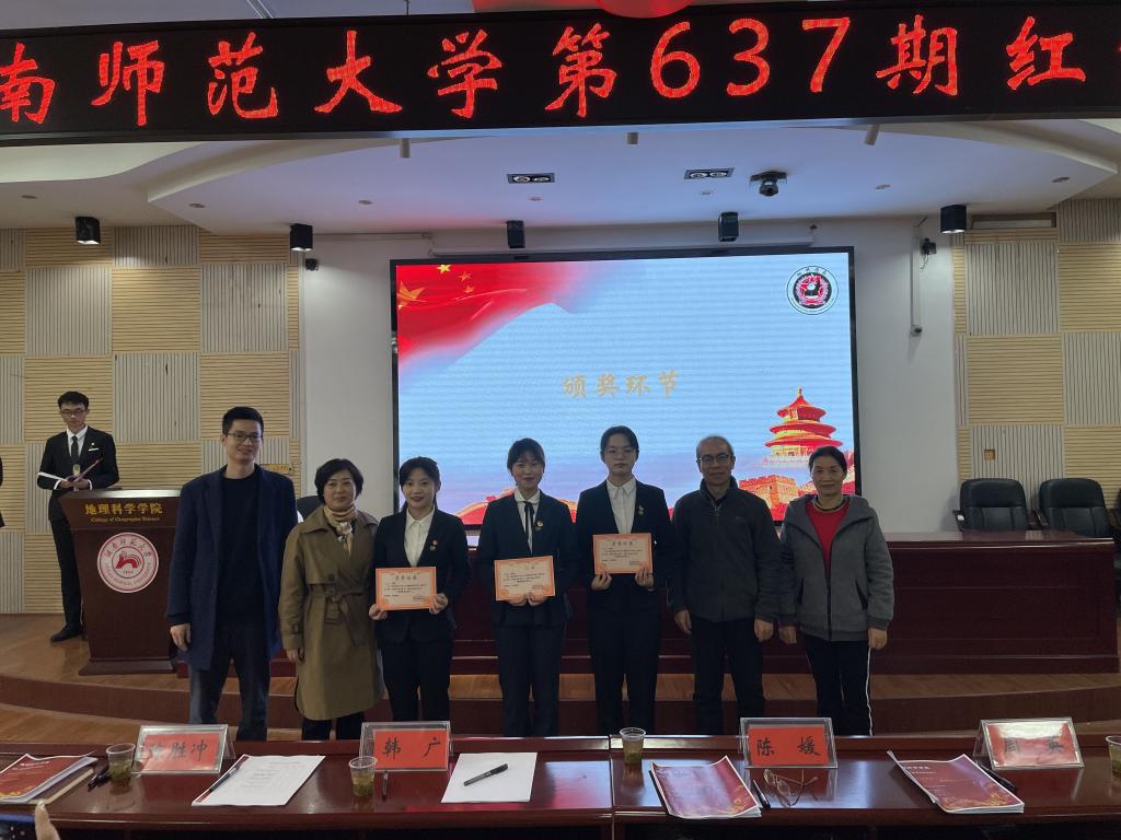 (通讯员 何建玲 崔丹丹 柳惠文)11月29日中午,地理科学学院第637期红色论坛主题活动“重温百年奋斗历程,展现青年时代担当”在地理科学学院301报告厅举行。出席此次活动的嘉宾有:地科院党委副书记陈媛老师,地科院创新训练中心兼地理科学专业老师韩广教授,地科院关工委常务副主任周英老师,学工办杨惠君老师,学工办陈胜冲老师。