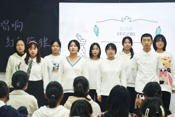 班歌比赛在主持人的开场中拉开帷幕,各班参赛人员按顺序出场表演。其中,检验班演唱了《少年中国说》,歌唱中,激昂的歌声配以少年们铿锵有力的呐喊,与百年前的梁启超隔空对话,歌颂少年的朝气蓬勃,也唱出了当代中国少年发奋图强的精神风骨。临床二班演唱了《奔跑》,展现了少年不惧艰险,执着追梦的青春风采。