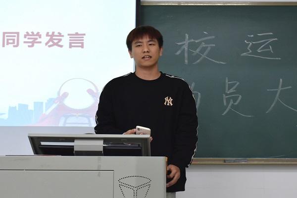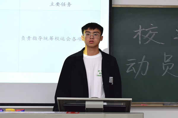 学生会文体部部长吴培荣详细说明了运动会工作的安排部署以及注意事项。他提到运动员应关注自身身体状况,积极备赛,展现出商学院的运动精神与良好风貌。