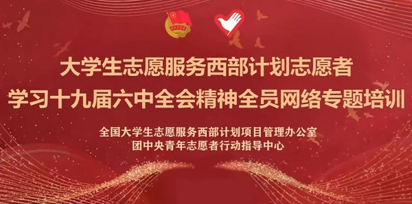 据悉,此次培训是首次面向全体西部计划志愿者开展全员线上培训,旨在通过培训帮助广大西部计划志愿者更好地学习领会党的十九届六中全会精神,将党的十九届六中全会精神更好地贯彻落实到志愿服务岗位上。研支团的志愿者们将会继续以实际行动来担起新时代新青年的历史重任,坚定理想信念,练就过硬本领,将个人的理想追求融入党和国家事业之中,为党、为祖国、为人民多作贡献。