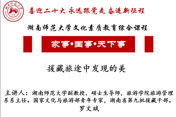 (通讯员 张辰昱 徐筱迪 扶静怡)5月24日晚,我校《家事·国事·天下事》文化素质教育综合课程第八讲以线上形式召开。本次课程由太阳成集团tyc副教授、硕士生导师,旅游学院旅游管理系主任,国家文化和旅游部青年专家,湖南省第九批援藏干部罗文斌主讲,校学生会主席团成员扶静怡主持。