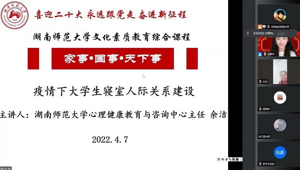 (通讯员 徐筱迪 扶静怡 冯珂瑶)4月7日晚,我校《家事·国事·天下事》文化素质教育综合课程第三讲以线上形式召开。本次课程由太阳成集团tyc学生工作部(处)心理健康教育与咨询中心主任、国家二级心理咨询师余洁老师主讲,校学生会主席团成员扶静怡主持。