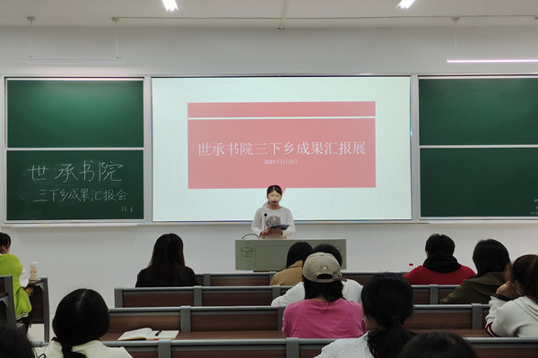 (通讯员 施绮幸 李京霖)11月3日下午4时,世承书院于文渊楼报告厅开展“三下乡”暑假社会实践成果汇报展,世承书院团委书记刘铮出席会议,4名实践队伍负责人夏文静、毕佳炜、楼语畅、施绮幸以及各班学生代表到场参加。