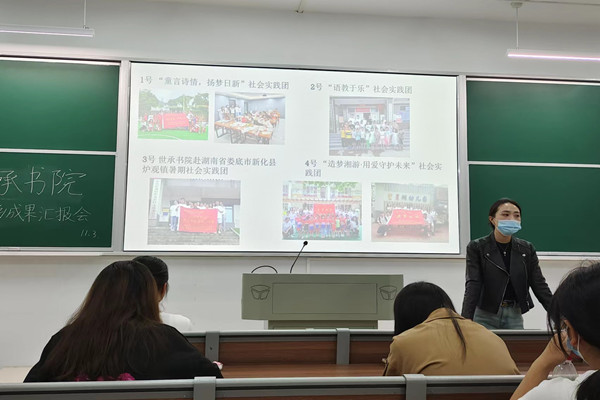 活动开始,世承书院团委社会实践部负责人夏文静进行主持,她对此次三下乡暑假社会实践活动做了简单总结,并介绍汇报流程。4名负责人依此进行成果汇报。“童言诗情,扬梦日新”社会实践团队长易韬以教学服务为重点,从山区孩子的成长蜕变中生动展现了教育关怀的温暖;“语教于乐”社会实践团队长毕佳炜以“一场温暖的助学之旅”为主题,通过介绍丰富全面的课堂开展进行成果展示;赴新化县炉观镇实践团队长楼语畅以调研线为中心,细致全面地展现了出彩的调研成果、教育服务、宣传效果。“造梦湘游·用爱守护未来”社会实践团队长施绮幸以“区校共建模式”为亮点,通过细腻的实践感悟,展现了教育调研双线并行的英语启蒙活动成果。