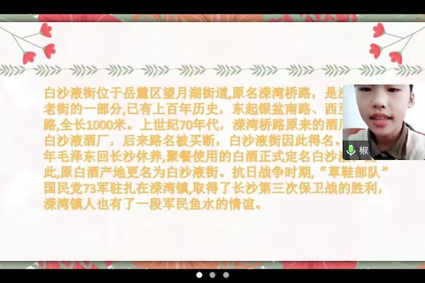 (通讯员 向语嫣 张泽宇)11月5日上午,教育科学学院团委青年志愿者工作部联合溁湾镇社区开展了“以少年志气,诵溁湾百年”系列第一期线上志愿活动。此次活动以“百年老街”为主题,共有5名志愿者,18名小朋友及其家长参加。
