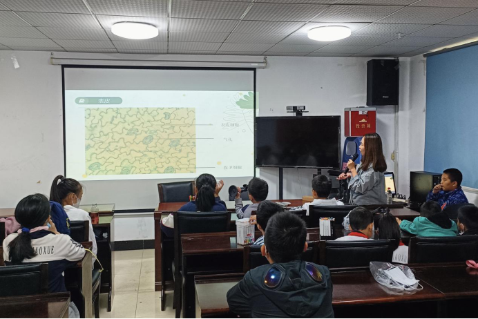 此次活动分为三个部分:科普叶子结构知识、观察叶子装片和制作叶子拓印画。何敏向小朋友们科普叶子结构的相关知识和叶子的生长机理,并设置趣味题目与小朋友们互动交流。在志愿者的带领下,孩子们通过借助显微镜的方式观察了夹竹桃和玉米叶横切装片。志愿者展示和讲解叶子的显微结构,让小朋友们切身体会到做实验的乐趣,并引导他们开动想象力制作叶子拓印画。