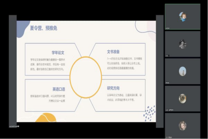 在此次活动中,罗涵予分享了保研的相关经验,具体介绍了参加各校夏令营的前期准备和注意事项。涂铭就预推免的相关内容进行了讲解,并传授了原始文献的查找方法。张若琼则主要介绍大学期间的学习方法,指出要保持阅读习惯,并对未来有清晰的定位与规划。何念秋围绕保研的准备经验进行介绍,指出要重视学年论文的撰写并保持良好的学习习惯。马宁泽对保研的相关内容进行了补充,并讲述了自己的实践经历。徐方远列举了自己的读书方法,并由吴诗仪进行补充和提升师范技能的相关经验的讲解。活动结束后,主讲人对参加人员的部分提问进行了解答。