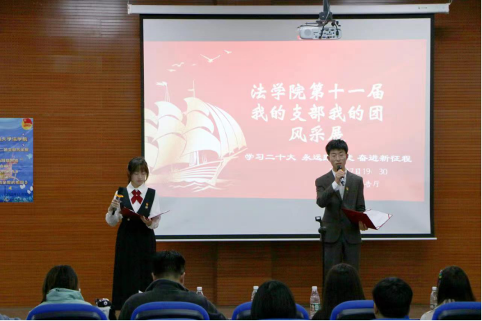(通讯员 陈为 梁延喆 匡宇晗)11月17日下午,法学院在张公岭报告厅举办第十一届“我的支部我的团”风采展活动。法学院党委副书记曹俊峰,2022级辅导员廖星参加此次活动。 此次活动由2022级本科生韩梦雨和陈颖担任主持人,学生系统主要学生干部担任评委。