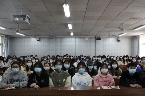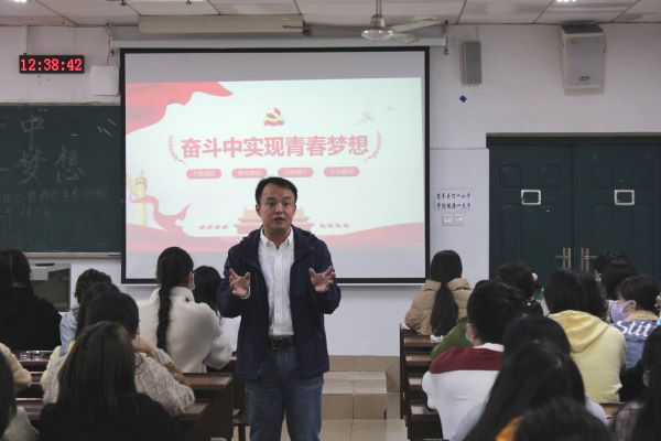 赵鑫海从“坚定伟大理想”、“勇担时代重担”、“坚持踏实躬行”、“矢志艰苦奋斗”四个部分阐释了青年如何在奋斗中实现青春梦想。他表示,青年志存高远才能激发奋进潜力,个人理想只有与国家、民族的前途和命运相结合才能得以实现。有信念、有梦想、有奋斗、有奉献的人生,才是有意义的人生。他希望同学们能够不畏艰险、乘风破浪,只争朝夕、不负韶华。