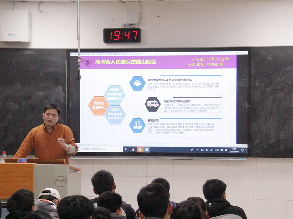(通讯员 汪郁菲 徐筱迪)11月17日晚,我校《成人·成才·成功》文化素质教育综合课程第七讲在至善楼205教室召开。此次课程由湖南省人民医院急诊医学部副主任、岳麓山院急诊三部主任、中国创伤救治培训湖南省域基地主任张兴文主讲,校学生会主席团成员徐筱迪主持。