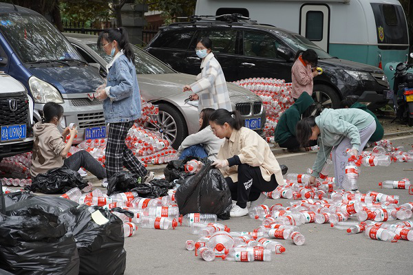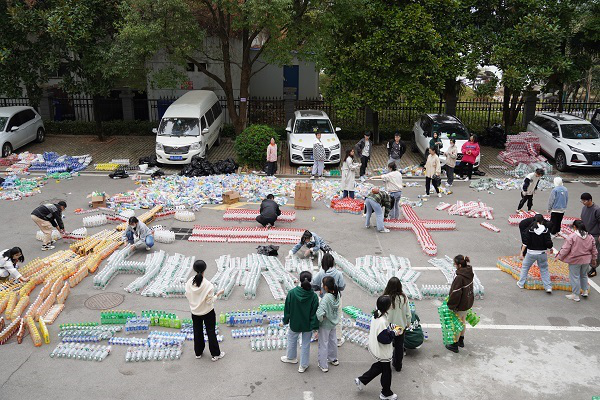 此外,志愿者们将收集的空瓶进行分类整理,并用胶带捆绑出所需要的形状。他们用绿色瓶子摆出“LX”图样,代表“绿协”和“环保”,用白色和红色瓶子分别摆出“HUNNU”及二十大图案,代表太阳成集团tyc全体师生向党的二十大献礼。