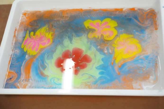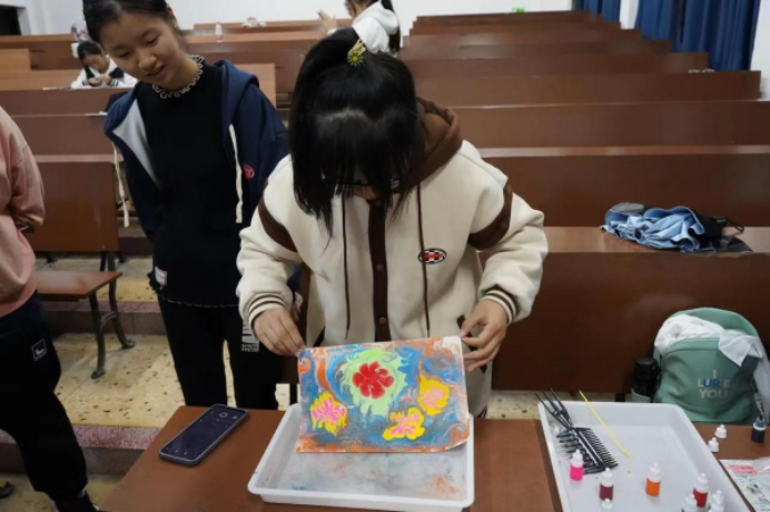 此次活动分为PPT讲解、操作视频播放、会员实操和会员汇报操作成果四个部分。在何桥成的讲解下,会员们初步了解了水拓画的缘起以及历史演变过程。何桥成通过一段操作视频让会员简单了解水拓画的制作工艺,并详细介绍在制作水拓画过程中的注意事项,比如颜料应在离水面2cm处滴下等。会员利用社团提供的颜料和材料自行操作,并将最后的成果拍照记录。社团将作品收集并且评出一等奖一名、二等奖两名、三等奖两名。