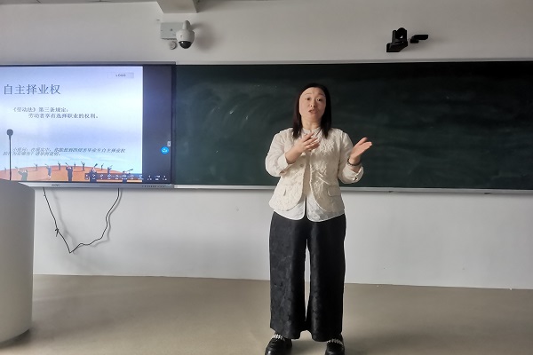 李俐主要从就业权益、侵权行为、自我保护途径、就业途径等五个方面向2023届毕业生解说就业过程中的权益知识。她结合相关案例,介绍了就业中的自主择业权、平等就业权、信息知情权和违约求偿权。在招聘各阶段中,如果遇到侵权和违法行为,同学们需要拿起法律武器保护自己。