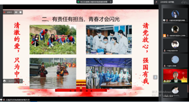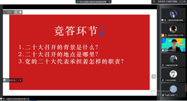 此次活动分为五个部分:工设院团委书记张杜豆老师致辞,奏唱团歌,主讲环节,竞答环节和肖坤洪老师点评总结。五位主讲人以演讲的形式为大家讲解他们对于党的二十大的看法、启示与感悟。其中还设置了提问环节,使主讲人和同学们有了进一步的交流。通过主讲人的讲述同学们对于党的二十大也有了进一步的了解。在竞答环节,姚宇彤提出关于党的二十大的问答题,随机抽取观众进行抢答,以增强了同学们的参与感,同时也加深了同学们对于二十大精神的感悟。