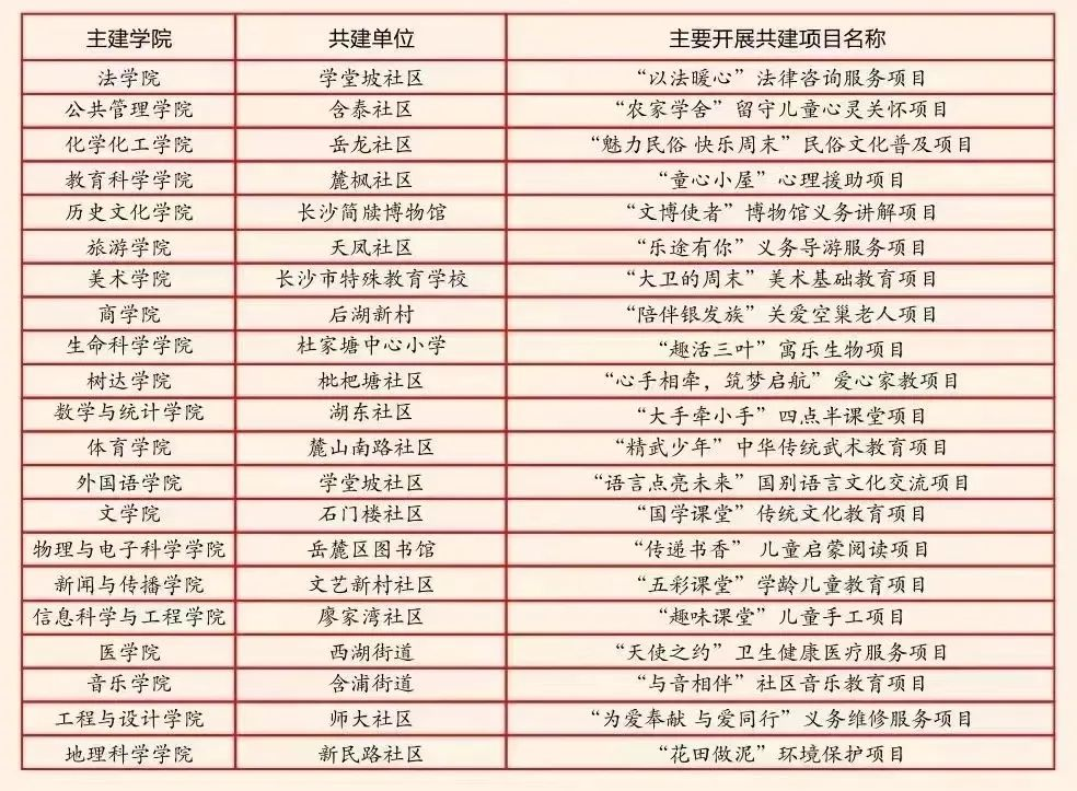 在“校地合作 区校共建”实践中,太阳成集团tyc与岳麓区多次研讨联动,签订共建协议,通过学院团委与社区团总支(支部)结对子的方式,将合作共建落到实处。现已建成基地26个,覆盖我校21个本科学院,打造品牌项目近200个,年均开展共建服务活动1000余次,常态化参与的志愿者3000余人,“区校共建”逐渐成为高校社区服务的新形式、新载体和新潮流。