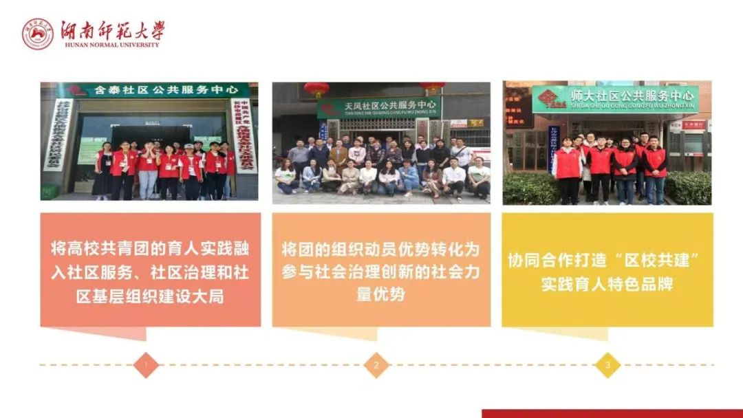 以社区治理事务为载体,围绕青少年成长成才、老年人老有所养、困难人群帮困、急难险重新任务、美丽新湖南建设,着力推动示范基地由引导青年学生“主动参与社区服务”到“主动参与社区治理”的提升。