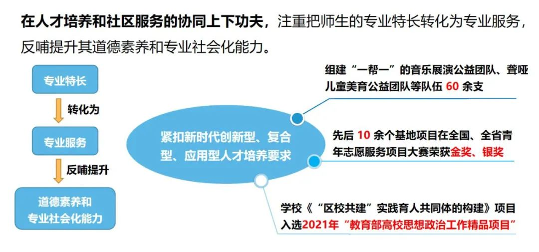 在人才培养和社区服务的协同上下功夫,注重把师生的专业特长转化为专业服务,反哺提升其道德素养和专业社会化能力,先后依托学校专业学科优势组建音乐展演公益团队、心理服务团队等队伍60余支,先后有10余个基地项目在全国、全省青年志愿服务项目大赛荣获金奖、银奖。