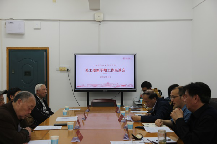 (通讯员 冯意萍 曹馨怡)3月10日下午,物理与电子科学学院于格物楼323会议室举行关工委新学期工作座谈会,校关工委副主任谭伟受邀莅临学院指导工作,院党委副书记兼关工委主任郭铭伟,关工委常务副主任唐咸林参加此次座谈会。