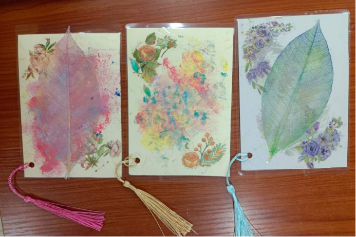 活动分为主持人介绍和会员制作两部分。范运沙向会员们介绍了叶脉书签的制作流程,分为染色、贴画、塑封、打孔、系流苏五个步骤。此次活动提供了颜料、贴画、卡纸、流苏等色彩丰富、形式多样的装饰材料,以及画笔、塑封机、叶片等基础材料,为会员进行创作提供了物质基础。会员利用材料进行各式各样的创作,根据喜好涂染上不同底色,绘画出不同图案。不同的想法,不同的风格在此次手工活动中激烈碰撞,迸发出千姿百态的叶脉书签。