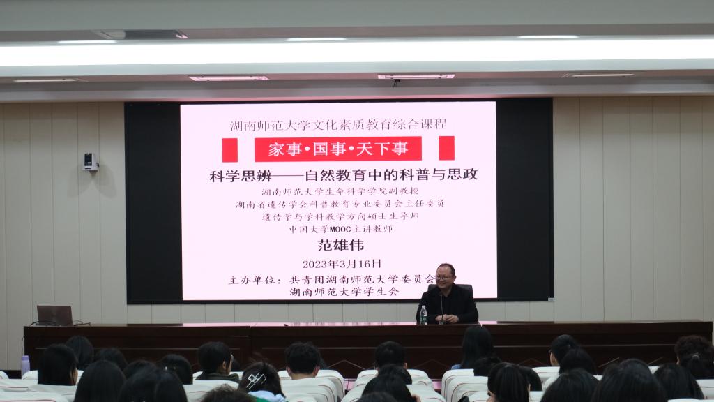 (通讯员 张子颖 汪郁菲 徐筱迪)3月16日晚,我校《家事·国事·天下事》文化素质教育综合课程第三讲在中和楼234报告厅开展。此次课程由湖南省遗传学会科普教育专业委员会主任委员、中国大学MOOC主讲教师、我校生命科学学院副教授范雄伟主讲,校学生会主席团成员邓凯主持。
