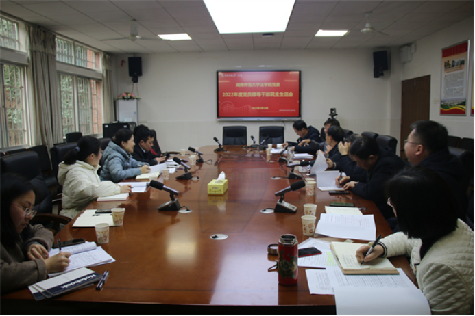 (通讯员 曾若兰 张娅晴 吴桐宇)2月24日下午,法学院党委在304会议室召开2022年度党员领导干部民主生活会,以“全面贯彻习近平新时代中国特色社会主义思想,深刻领悟‘两个确立’的决定性意义,增强‘四个意识’、坚定‘四个自信’、做到‘两个维护’,团结带领党员干部群众以奋发有为的精神贯彻落实党的二十大作出的重大决策部署”为主题,对照党的二十大精神和党章党规党纪,联系思想和工作实际,重点从六个方面进行对照检查,深刻剖析原因,开展批评和自我批评。我校第二督导组组长、党委宣传部部长段巍,副组长、学生工作部部长向发意到场指导。校巡察办于烽,院长肖北庚,正处级专职组织员陈胜国,副院长欧福永、耿自强、何燕华,院党委副书记曹俊峰,院党委委员李爱年、喻名峰参加会议。会议由院党委书记唐建文主持。