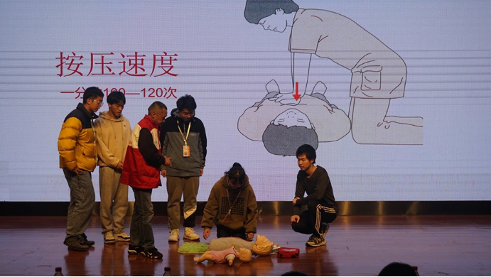 在实训环节中,孙怀东向同学们分别演示心肺复苏和使用AED的正确方式,并对上台实训的同学进行指导。他表示,网络上存在对急救知识的虚假宣传,希望同学们认真领会急救技能的动作要领,认识到正确实施急救措施的重要性。