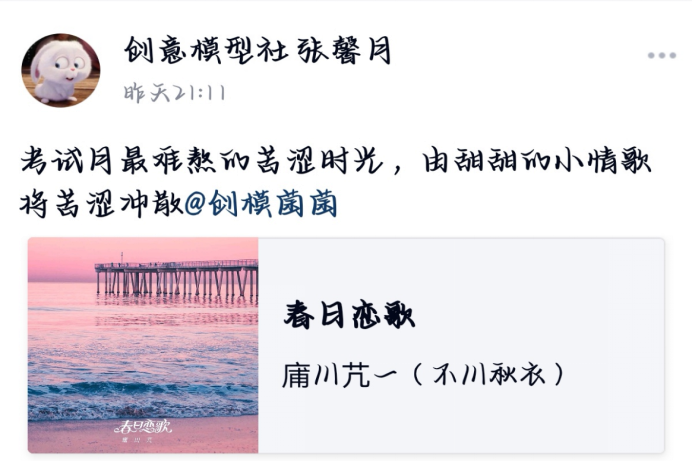(通讯员 李可文 庾雪菲)3月13日至17日,生命科学学院创意模型社于线上举办“音乐有你,乐享人生”分享活动,生科院创模社副理事长向蓉禧担任此次活动的负责人。