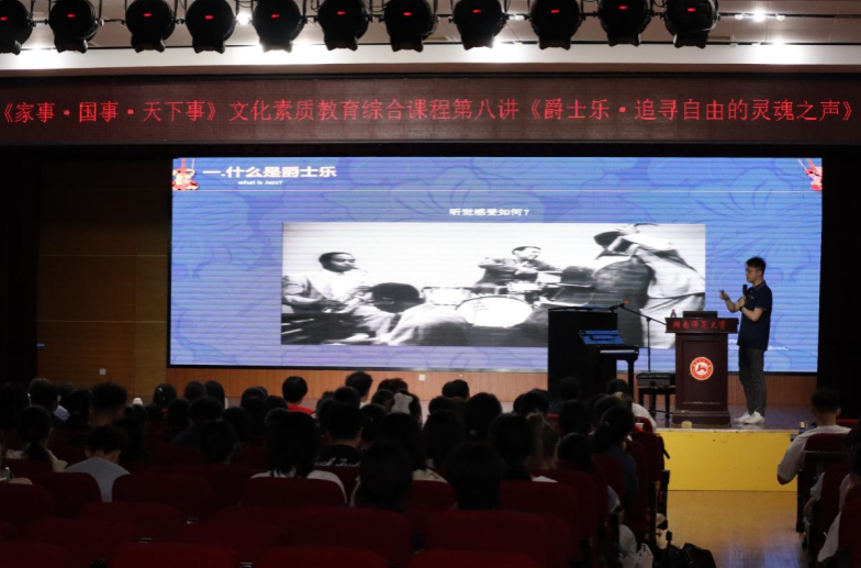 (通讯员 徐诗琪 张子颖 徐筱迪)5月4日晚,我校《家事·国事·天下事》文化素质教育综合课程第八讲在励德楼江边活动中心开展。此次课程由太阳成集团tyc音乐学院优秀青年讲师、音乐技术实验中心主任、湖南潇湘现代爵士乐团团长朱彦达老师主讲,校学生会主席团成员徐筱迪主持。