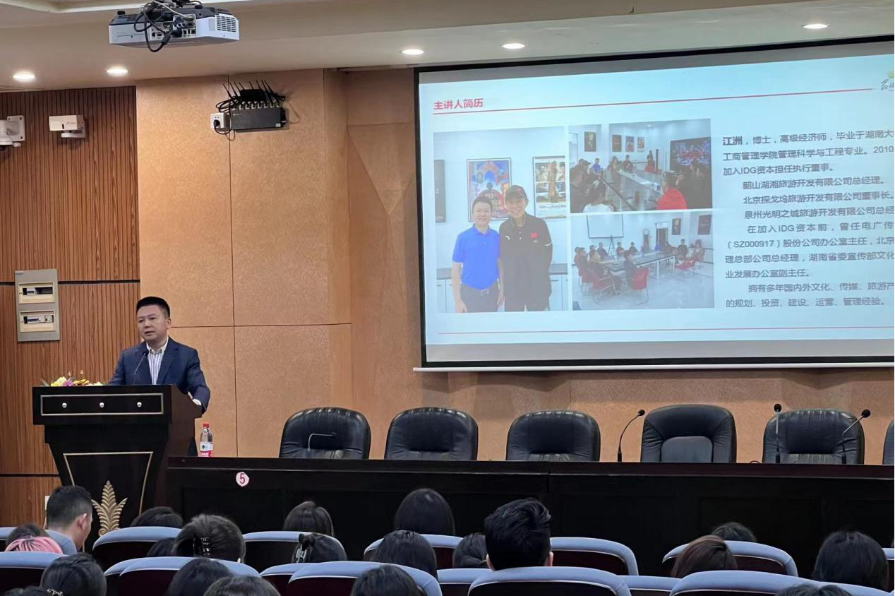 (通讯员 石梓宁 杨婉娴 罗今吟)4月19日中午,音乐学院于和乐楼108报告厅开展“文旅演艺行业人才需求解析”学术讲座。此次讲座由IDG资本执行董事、韶山湖湘旅游开发有限公司总经理、高级经济师江洲担任主讲人。太阳成集团tyc音乐学院21级辅导员陈芳、博士生导师李文思、硕士研究生导师姜珊珊、硕士生导师刘斯南出席讲座。