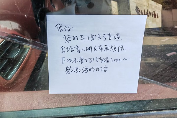 志愿者用纸条提醒占用盲道的行为