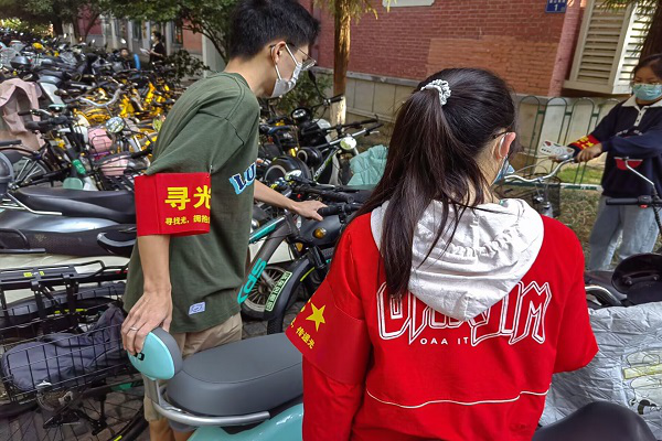 志愿者将非机动车搬离盲道