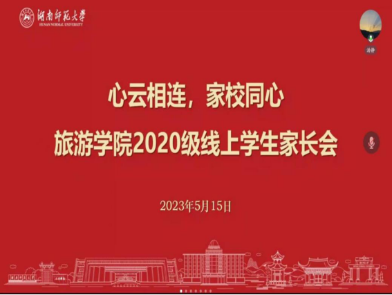 (通讯员 邱粤湘 王晗)为深入学习宣传贯彻党的二十大精神,持续做好学生的学业规划指导服务工作,旅游学院于5月15日晚召开主题为“心云相连,家校同心”2020级本科生线上家长会。旅游学院党委副书记廖欢,旅游管理系副主任汤静,酒店管理系主任唐健雄、副主任伍蕾,会展经济与管理系副主任朱张祥出席会议。会议主持人为旅游学院2020级辅导员邱粤湘,2020级全体本科生家长参与了会议。