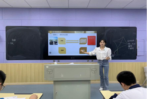 会议伊始,高中实习老师组曹婧、初中组王艺璇进行公开课展示。其中,曹婧围绕课题《民族区域自治制度》采用议题式教学法,帮助学生铸牢中华民族共同体意识。王艺璇围绕课题《自由平等的真谛》,采用活动教学法,带领学生在活动中学习自由与平等的内涵。